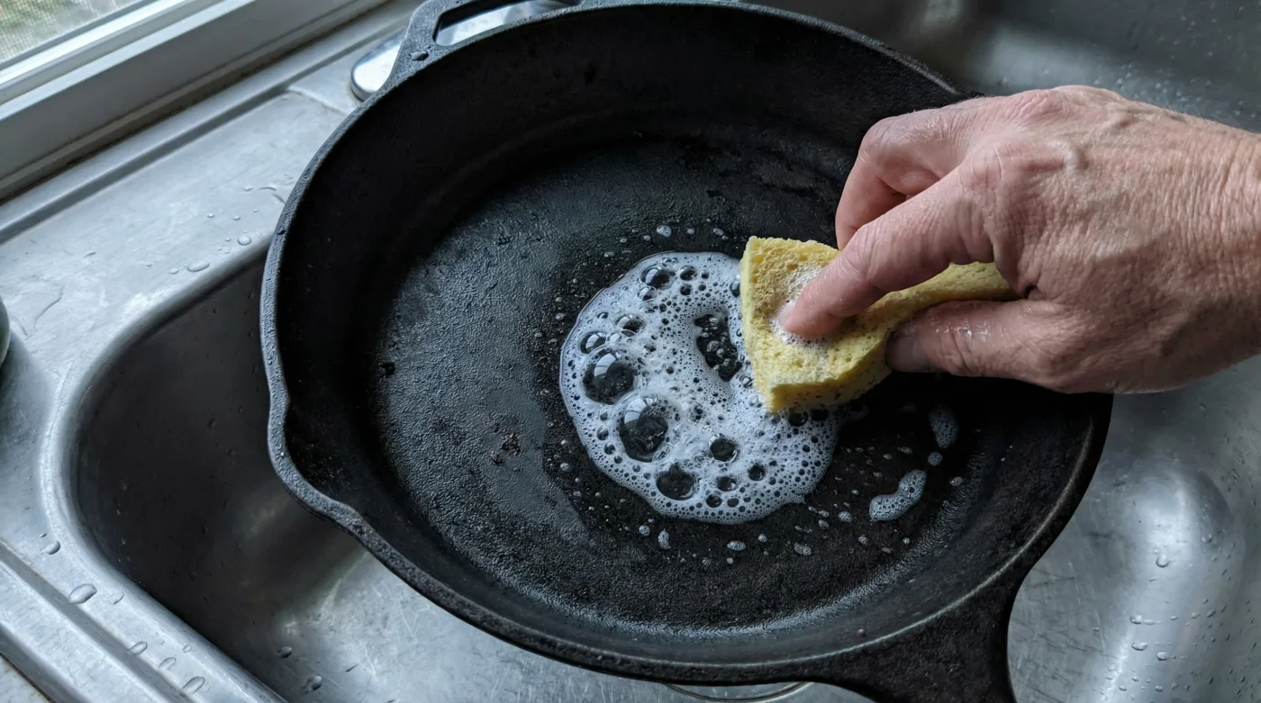 You stand over the kitchen sink, staring at the heavy black skillet resting on the drainboard. It still carries the faint odour of yesterday’s seared sausages and a lingering layer of stubborn grease. You scrub it with scalding hot water and a coarse brush, aggressively avoiding the green bottle of dish soap next to the tap as if it were poison. The result is a sticky, slightly tacky surface. You have been told your entire life that a single drop of suds will ruin generations of hard-earned seasoning. But as your fingers trace the gummy rim, a quiet frustration sets in. You are not preserving culinary history; you are simply cooking on dirty iron.
